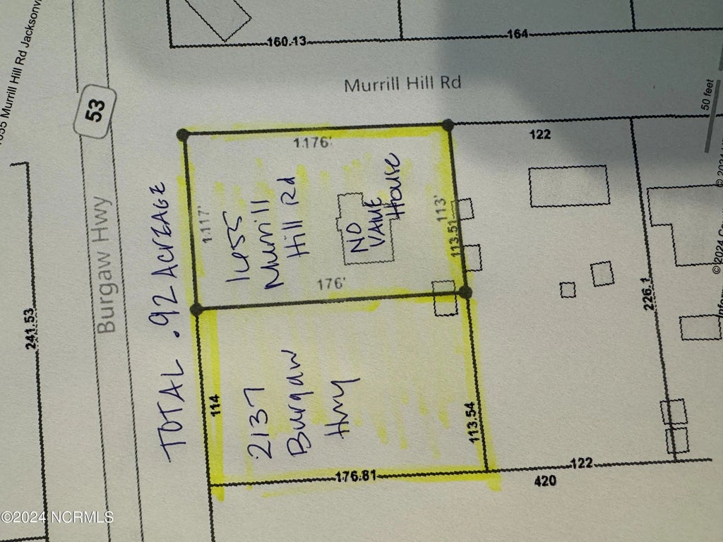 Commercial Building Site at the intersection of Murrill Hill and Burgaw Hwy! Diagonally across from the Family Dollar, across the street from a gas station and less than a mile from the New Dollar General. .92 Total acreage and 229' road frontage (as show on plat map) includes 2 parcels- 1655 Murrill Hill Rd (MLS 100449243) and 2137 Burgaw Hwy. House on 1655 Murrill Hill Rd has no value. Being sold AS IS. Being sold AS IS. 1655 Murrill Hill Septic on site- Waiting on permit from Onslow County Health Dept. Water & Electric ran