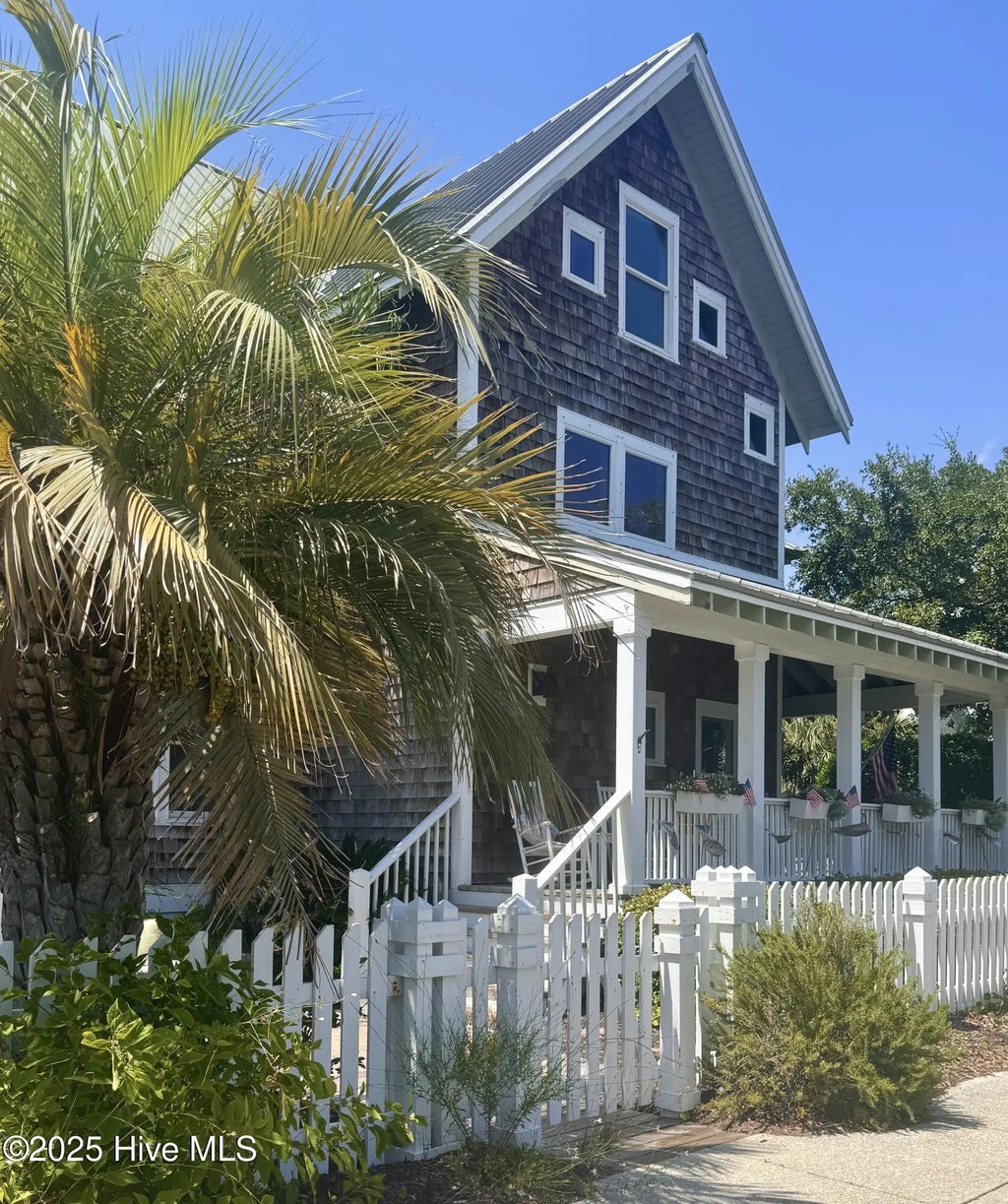 Coastal charm on one of the island's most iconic corners. At the meeting of Keelson Row and Transom Row, this Nantucket-style retreat offers front row views of the marina, sweeping saltwater marshes, and the daily rhythm of Bald Head Island. With 4 bedrooms and 4.5 baths total, the home spans just over 2,300 square feet and is designed for laid-back island living. The reverse floor plan makes the most of its elevated views. Upstairs, the vaulted living room opens to a screened porch where you can watch boats drift by and spot the beacon of Old Baldy. A renovated kitchen blends coastal character with modern function, creating a warm and welcoming flow throughout. On the main level, you will find two guest suites. One of which opens directly to a covered porch with a swinging bed that catches the breeze and invites long, lazy afternoons. Just outside, the wraparound front porch is lined with rocking chairs and offers a perfect perch to watch the island go by. A cozy fire pit patio just off the side adds one more spot to unwind. The top-floor primary suite is a true retreat with sweeping marsh views, a cozy reading nook, and a spacious walk-in shower. The crofter, accessed by a spiral staircase, offers two twin beds and a full bath for guests or flexible living space. Sold furnished and including two 4-passenger golf carts, this home offers a front porch lifestyle made for slow mornings, sunset views, and timeless island memories.