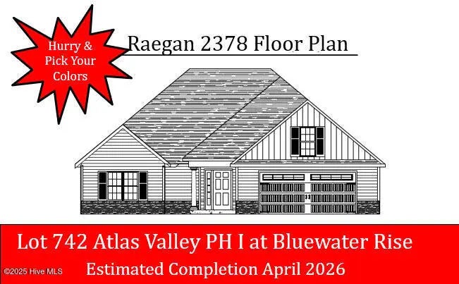 The ''Raegan 2378'' floor plan is under construction in the new Atlas Valley Phase of Bluewater Rise. Contract early & make design center selections. Builder offering $10,000 buyers closing cost assistance w/ use of preferred lender and closing attorney. Features include granite counter-tops, gas log fireplace, covered back porch, trey ceilings in the family room & master suite with his & hers closets! Finished bonus room can be 4th bedroom. Creekside school district! Minutes from downtown New Bern & Cherry Point MCAS.